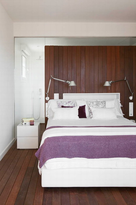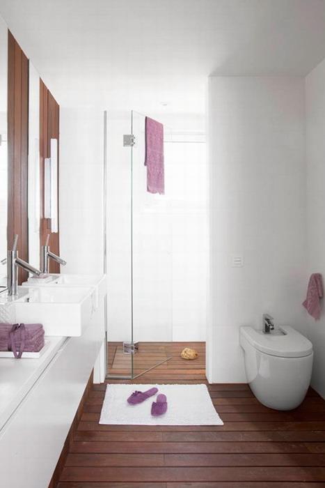 Полы в спальне и в ванной, в одном стиле, набраны из добротной доски.