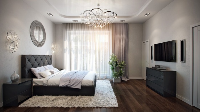 Освещение спальни лучше сделать трёх типов: основное, локальное и декоративное. В качестве основного освещения выступает люстра, которая даёт мягкий приглушённый свет. Но иногда основное освещение не используется, и заменяется торшерами или бра. Локальное освещение устанавливается в функциональных зонах спальни, например над туалетным столиком или креслом. Декоративное освещение необходимо для подчеркивания деталей интерьера и создания атмосферы таинственности в спальне.