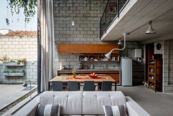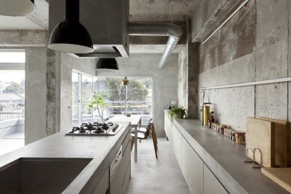 Стиль минимализм в кухне неплохо сочетается с «промышленным» дизайном остальных помещений