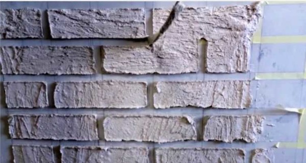 После — нанести на стену гипсовую или другую штукатурку. Слой — порядка 2 см. Выравнивать идеально не стоит, но поверхность должна быть более-менее ровной. Пока раствор не застыл, снимается малярный скотч, открываются швы. Неопрятно висящие куски подбираются, края слегка разравниваются. Получается вполне приличная имитация.