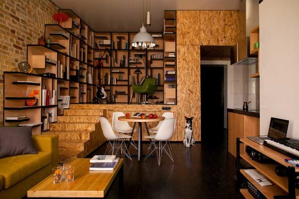 Используют при оформлении квартир, особенно небольших, ОСП (OSB), причем в необработанном виде. В смысле — неокрашенном. Покрыть его можно морилкой или лаком на водной основе, главное — чтобы не было блестящей пленки.