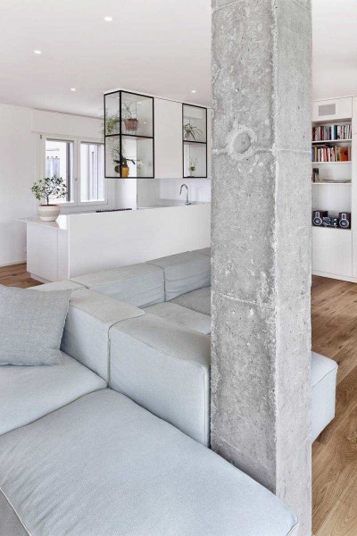 Стены в стиле лофт не всегда неотделанные. Часто они имеют гладкую поверхность, но в противовес необработанным оставляют потолок или несколько колонн в «первозданном» виде.