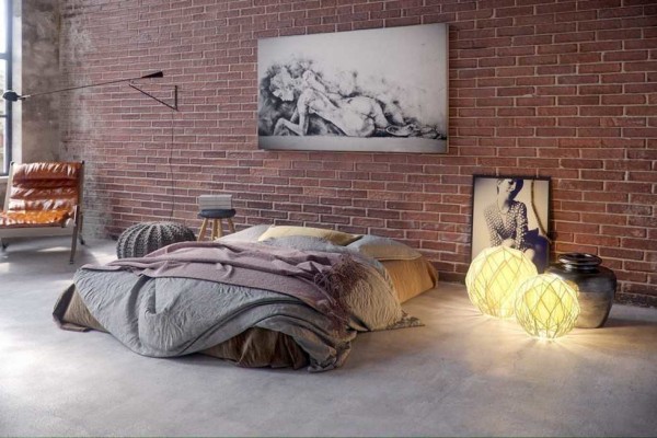 Стиль лофт в спальне — это самая «больная» тема. По идее спальня должна быть открытой. Но мало кто соглашается на такие эксперименты. В остальном — стены (или одна стена) грубой обработки, на полу — ковер и шикарная кровать. Из обстановки все. Если нужен шкаф, он может прятаться за дверью, которая на фоне стены может быть и незаметной.