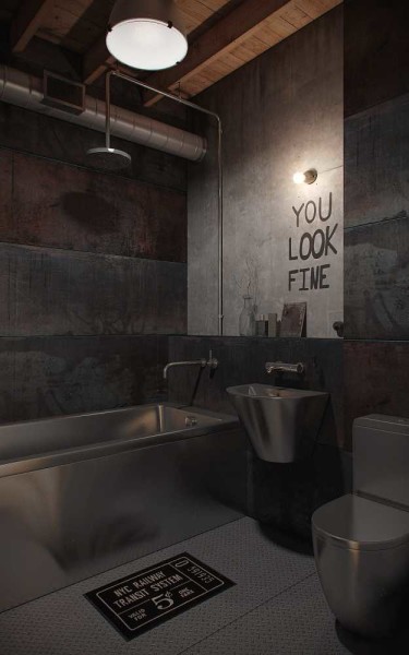 Любой стиль многогранен, и лофт — не исключение. Особенно остро это ощущается почему-то именно в ванной: слишком разные подходы к выполнению одной и той же задачи. Например, на фото ниже — это только формальное выполнение требований стиля: простые ровные формы сантехники, такие же простые плафоны, сдержанная цветовая гамма. Только легкий налет стиля, которые, тем не менее, четко угадывается.