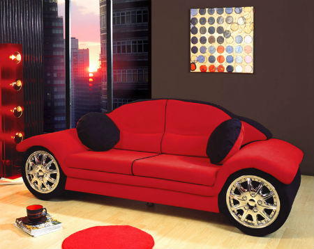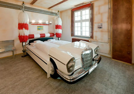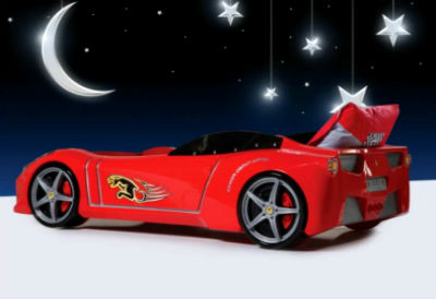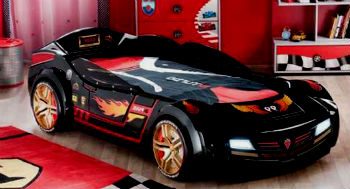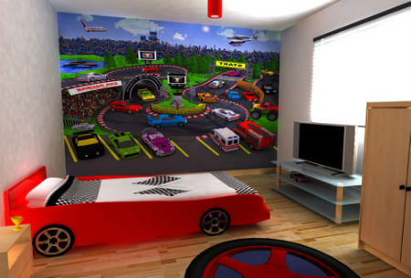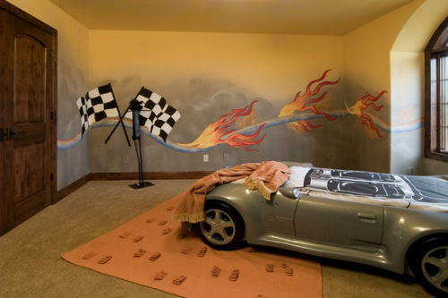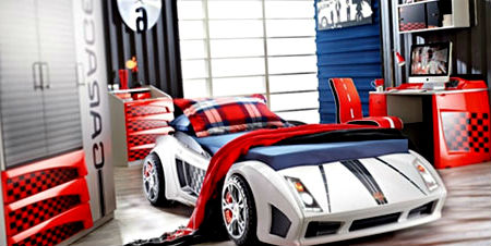 Мебель можно изготовить под заказ: кровать в виде автомобиля, тумбочку и комод — имитирующими покрышки. Шкаф и компьютерный стол — таких же плавных, слегка округлых форм. Всю мебель подобрать в светлых оттенках, но с яркими вставками, такой комнате подойдут оттенки зеленого, оранжевого, красного или голубого.