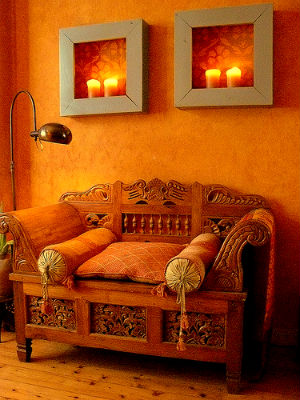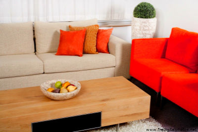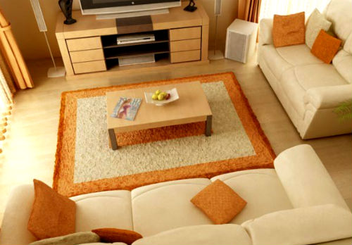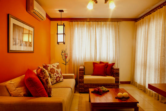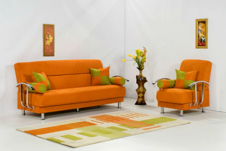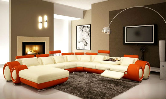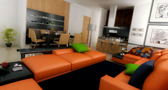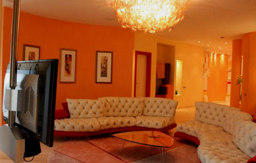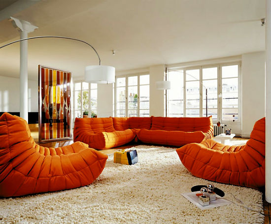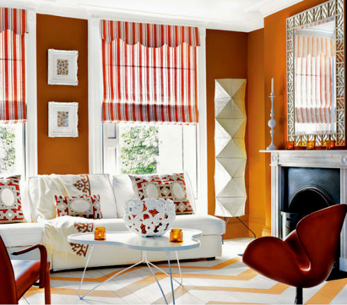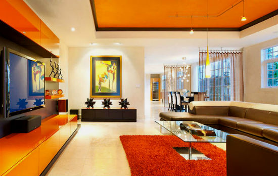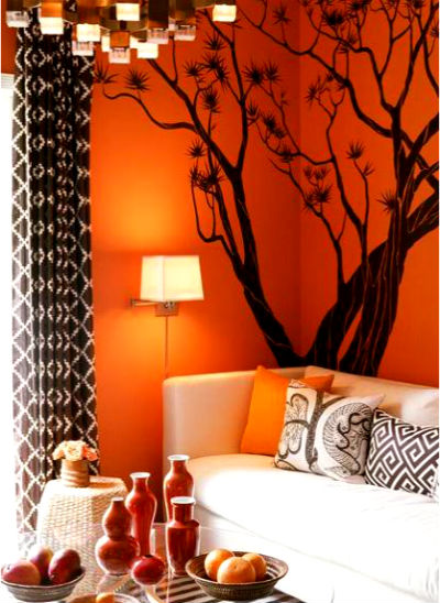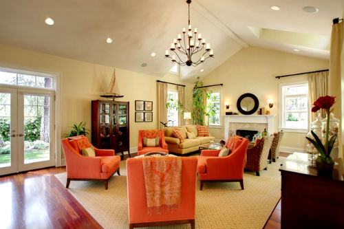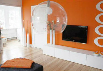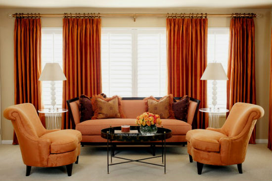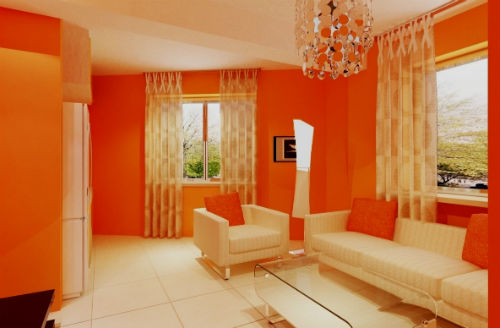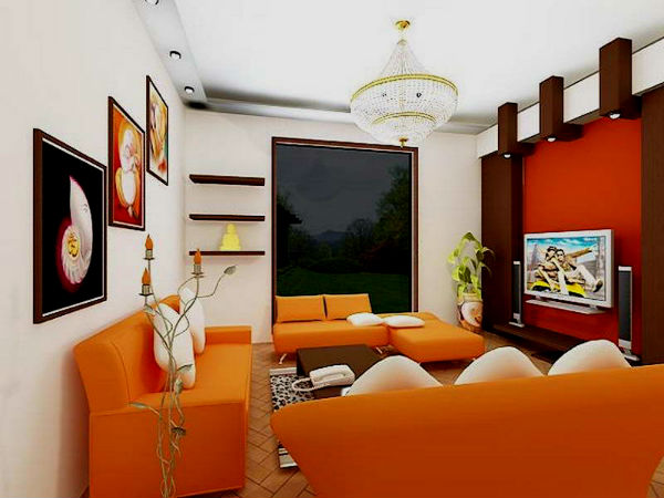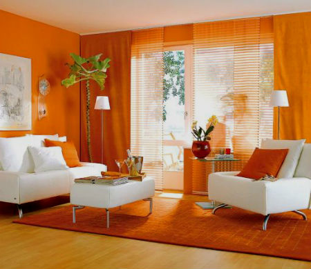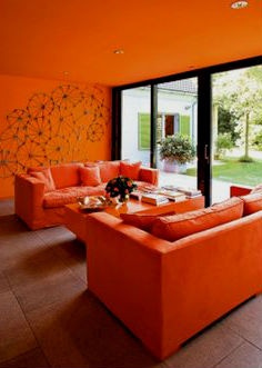 Оранжевый цвет прекрасно будет смотреться в оформлении мебели, штор, подушек, напольного ковра и потолочных плинтусов. Но в случае выбора оранжевых стен, мебель напротив лучше подбирать из светлых, кремовых оттенков. К примеру, если стены бледно-оранжевые, то мебель может быть более насыщенной по цвету, и в обратном порядке стены яркие — мебель бледная. Конечно, особо эксцентричные натуры могут позволить себе оформление гостиной, полностью в оранжевом цвете, но такая комната будет давить своим ярким и сочным оттенком и ощущение уюта может перерасти в давящее и даже волнительное состояние. Оранжевая гостиная, хоть и является своеобразным генератором радости, но все же не следует ее прегружать выбранным цветом.
