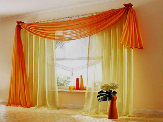 Шторы подбирать исходя из оттенка диванной обивки или цвета покрывал (пледов), великолепно будут смотреться, как легкие шифоновые ткани, так и плотные материалы.