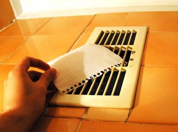Если тяга есть, но и грибок тоже, продолжаем тесты. Надо снова проделать ту же операцию — поднести листок бумаги — надо и при закрытой двери в ванную. Если в этом случае тяги нет (листок не притягивается), а с открытой дверью он к решетке «прилипал», дверь установлена слишком герметично. Для притока воздуха внизу должна быть щель не менее 3 см. Второй вариант — вентиляционные решетки для поступления воздуха.