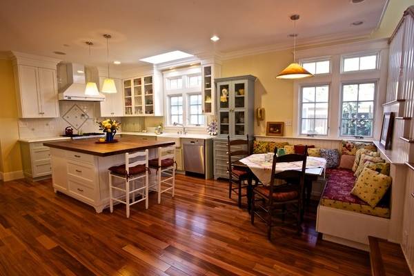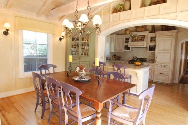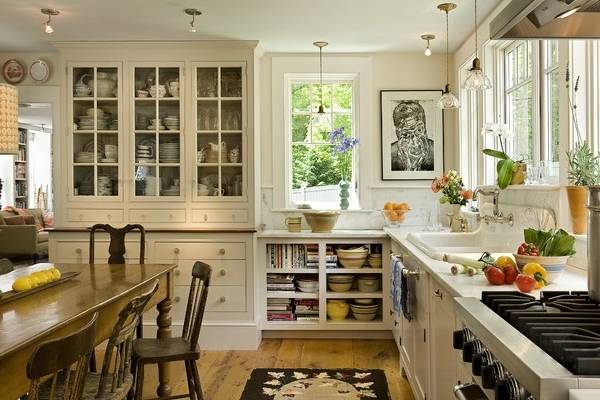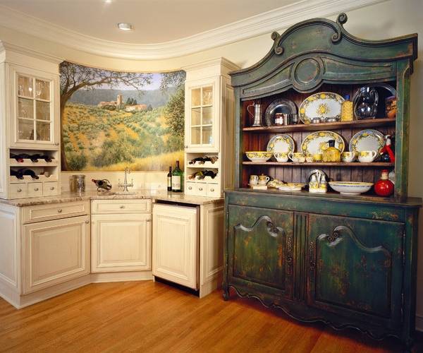 Шкаф буфет идеально подойдет для кухни в стиле прованс или кантри, даже если его цвет не будет совпадать с остальными кухонными шкафчиками. Верхние полки буфета могут быть использованы для хранения чашек, декоративных тарелок, баночек для специй, чайных коробок и разных аксессуаров. Вместительные полки внизу прекрасно подойдут для больших кухонных принадлежностей, таких как банки с крупами, кастрюли и сковородки. Чтобы буфет вписывался в обстановку наилучшим образом, его лучше покрыть такой же столешницей, что и на остальных нижних шкафчиках кухни. Старинные шторы и настенный декор помогут завершить очаровательный дизайн кухни в провинциальном духе.