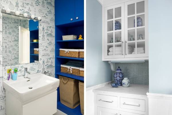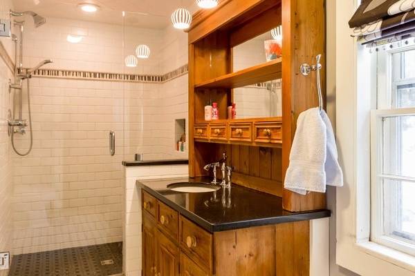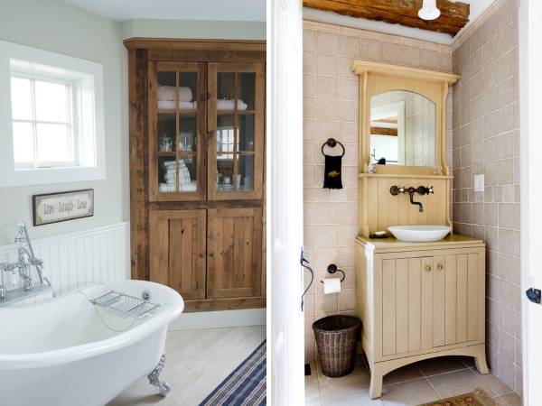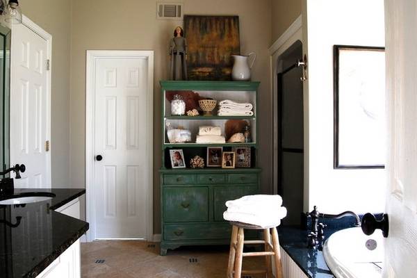 Какой вариант вам больше нравится: старинный буфет в роли тумбы под умывальник или же в качестве шкафа для хранения полотенец и других ванных принадлежностей?