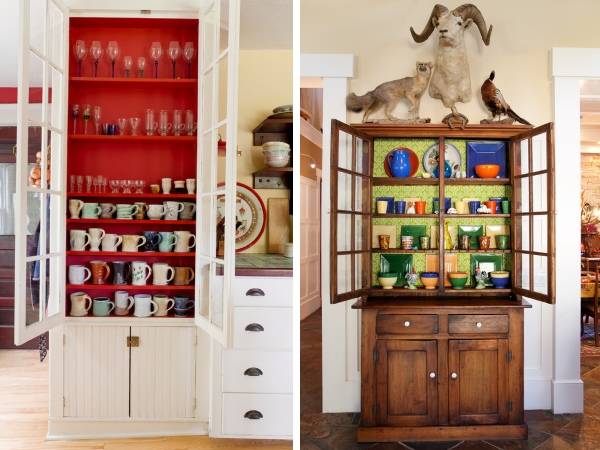 3. Применить нейтральную краску снаружи, а внутреннюю полость буфета (та, что за прозрачными дверцами) окрасить в яркий цвет.