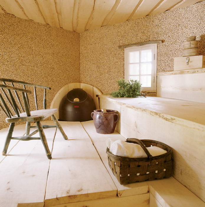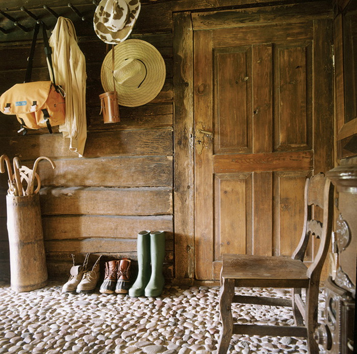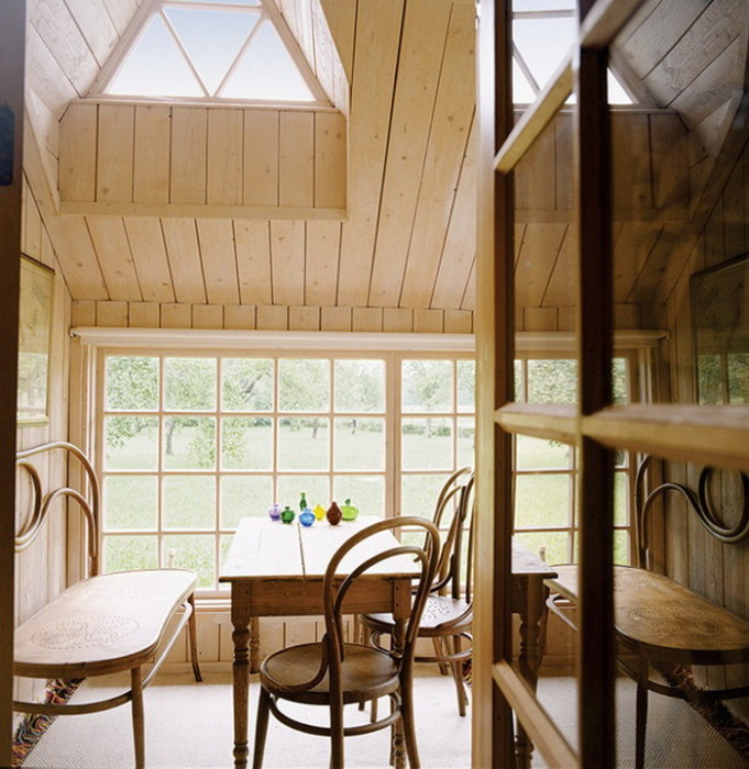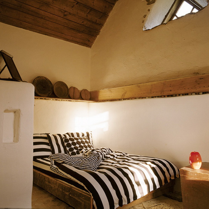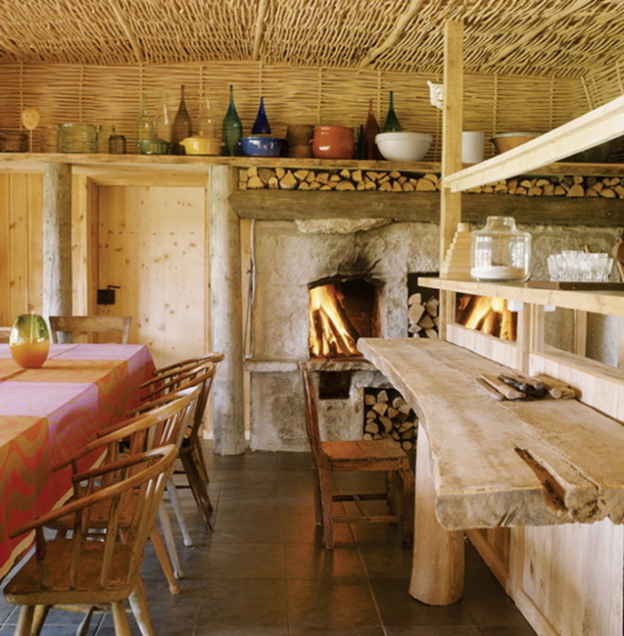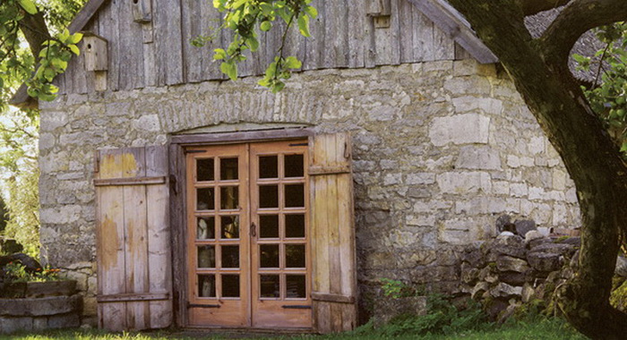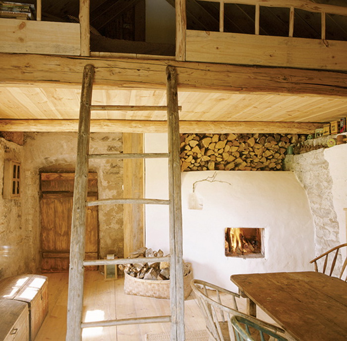 Старинный домик с современным интерьером. Многие из материалов, которые использовались при реставрации дома, удалось просто собрать в окрестностях бесплатно, для этого понадобилось потратить всего лишь немного бесценного личного времени. Например, камень, которым устелили пол кухни, собирали на берегу близлежащей реки, потолок на кухне декорирован местным каштаном, а стены – можжевельником. Нашлось применение и для старых деревьев в саду, они стали замечательным местом для отдыха в гамаке.