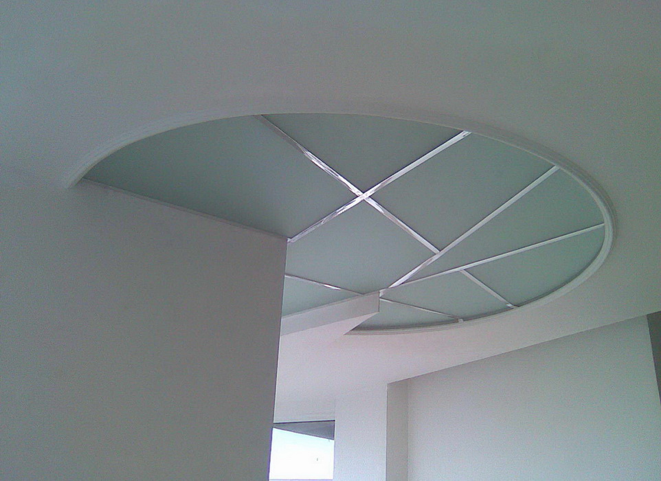 Стеклянный потолок служит декоративным элементом, повторяющим стилевые решения интерьера. Он может быть установлен в любом помещении, даже с повышенным показателем влажности. Стеклянные потолочные панели можно сделать различной формы и дизайна, из цветного стекла, стекла с рисунками, стекла с фьюзингом или витражом. Очень хорошо установить стеклянный потолок в ванной комнате. Изготавливаются потолки из закаленного стекла с пленкой, препятствующей выпадению осколков.