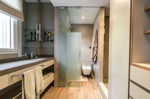 Также стоит отметить, что все эти двери будут интересно смотреться в сочетании с деревянными, металлическими или пластиковыми вставками. Далее на фото вы можете посмотреть различные варианты стеклянных дверей, используемых в реальных интерьерах для ванной комнаты.