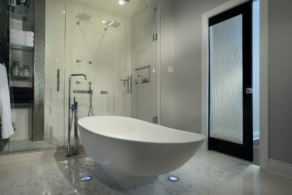 Согласитесь, что не каждый из вас решится на установку стеклянных дверей в ванную комнату, несмотря на то, что это выглядит красиво и оригинально. Ведь многие просто стесняются выставлять помещение для личной гигиены на всеобщее обозрение. Но выход есть. Вы можете использовать двери из непрозрачного стекла, как то: