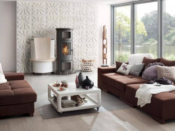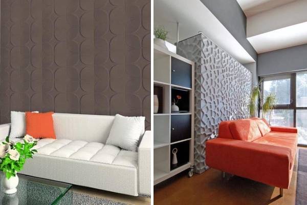 Так, модульные панели для стен, как правило, представляют собой прямоугольники материала (часто с узорами или текстурной отделкой, например, тканями или обоями), которые можно размещать на стене по своему усмотрению: встык или с промежутками, только в верхней или нижней части стены и т. д. Другим распространенным видом стеновых панелей является деревянная или пластиковая вагонка — узкие доски, которые плотно подгоняются друг к другу на профилях. Третий тип — это широкие листы плотного пластика, который в отличие от других видов клеится на стены, а не монтируется с помощью профилей. Ярким примером последних являются популярные австрийские декоративные панели SIBU.