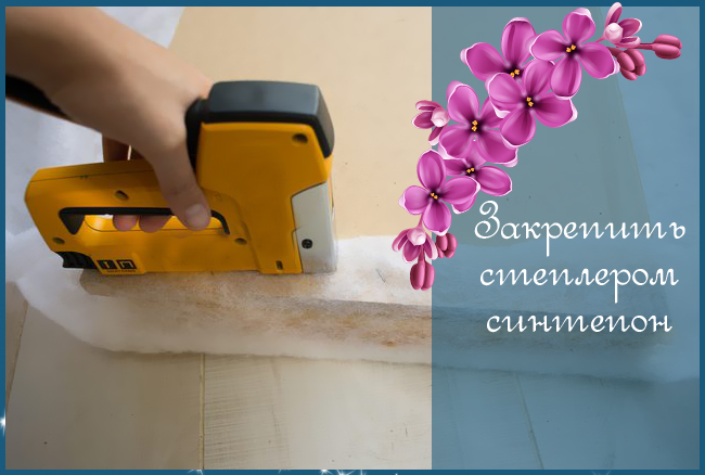 На пол первым делом укладывается синтепон с запасом по краям, на него кладется поролон по размеру сиденья, сверху укладывается плита ДВП. Синтепон хорошенько натягивается по краям и крепится к панели ДВП скобами мебельного степлера.