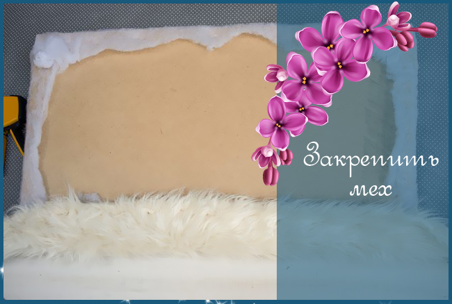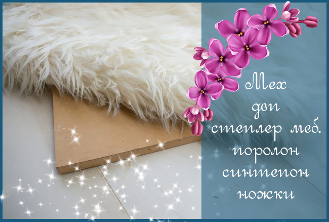 На следующем этапе прикручиваются ножки в нужные места сиденья, по краям. А затем закрепляется мех, его тоже нужно подготовить с запасом по краям, а затем закрепить скобами мебельного степлера и приклеить полимерным клеем.