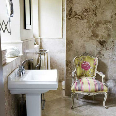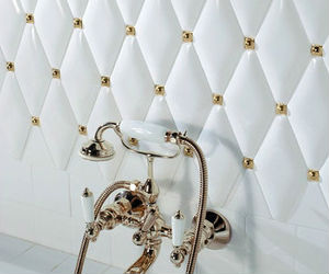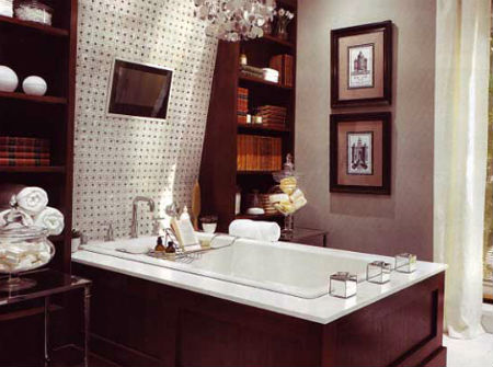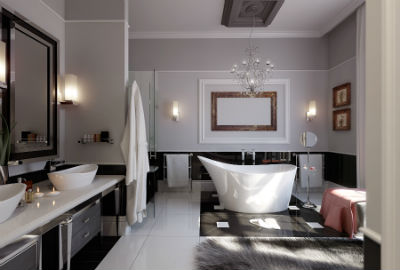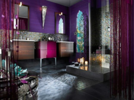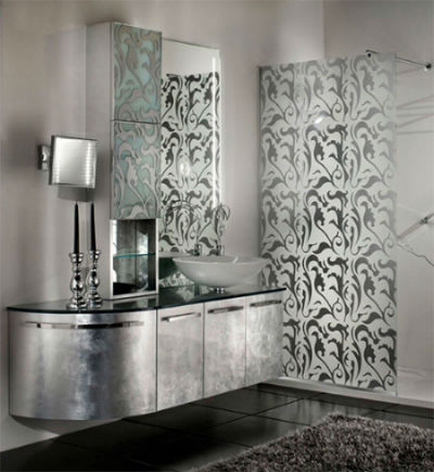 Дополнить помещение можно напольными вазами с модным орнаментом или вставками из страз, золотистыми или хромированными смесителями, необычными вешалками для полотенец, низко свисающей хрустальной люстрой, портретами модных кумиров, цветными свечами, зеркальной рамой в стразах.