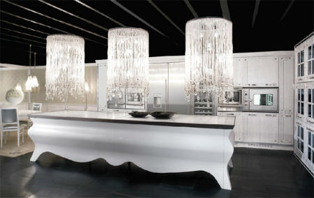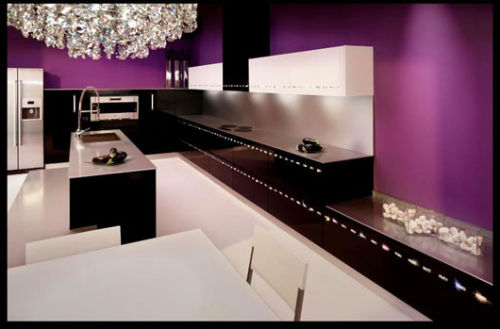 Что касается декоративной части, гламур в интерьере кухни, будет достигнут при умелом распределении акцентов, на стены можно повесить портреты кинозвезд, где-нибудь в углу установить торшер, а также приобрести хрустальную люстру, несколько керамических, серебристых горшков для цветов.