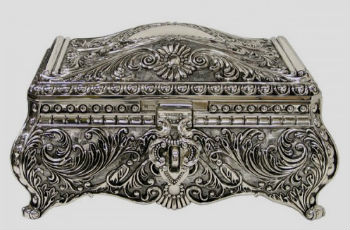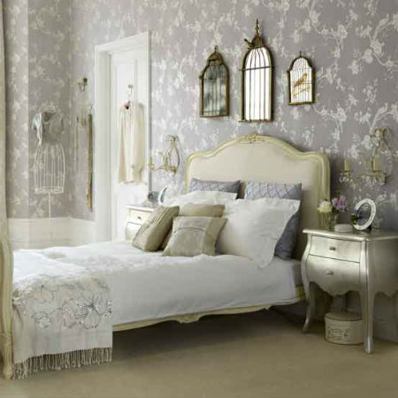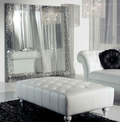 Декорировать спальню следует модными фоторамками, картинами в рамах цвета металлик, напольными вазами со стразами, напольным ковром с витиеватым узором, а также напольным зеркалом.