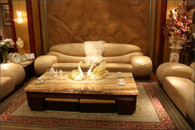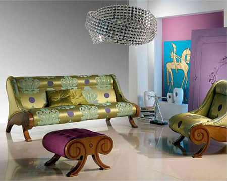Мебель в гостиную лучше приобрести в классическом стиле, с округлыми подлокотниками и на невысоких ножках, обивка диванов и кресел может быть кожаной или велюровой, лучше нестандартного окраса: золотистого, серебристого, розового или под шкуры животных (зебры, леопарда, жирафа).