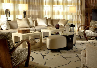 В таком помещении, великолепно будет смотреться глянцевый, цветной журнальный столик или прозрачный стеклянный. А также напольные торшеры, изысканная ширма, несколько стильных ваз, множество подушек, фотографии в хромированных фоторамках, зеркало на всю стену или зеркальный потолок. Дополнительный шик данному стилю, прибавят межкомнатные двери с фотопечатью, в качестве изображения можно выбрать любой рисунок, к примеру, если в интерьере присутствуют элементы «под зебру», то и двери с таким принтом будут смотреться просто великолепно. Ну и конечно нельзя забыть про напольный ковер, предпочтение лучше отдать моделям с высоким ворсом или опять же имитирующим шкуры животных.