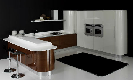 В интерьере кухни, главным и стильным элементом будет являться кухонный гарнитур, он вполне может задать тон всему помещению. Поэтому нужно приобрести гарнитур интересной расцветки с глянцевым эффектом. Что касается цвета, прекрасно будет смотреться белый, красный, розовый, фиолетовый и даже черный гарнитур. Обеденный стол тоже нельзя обделить вниманием, приветствуется стол на витиеватых, резных ножках. А к нему нужно будет приобрести подходящие по стилю стулья.