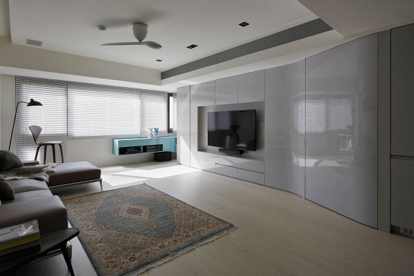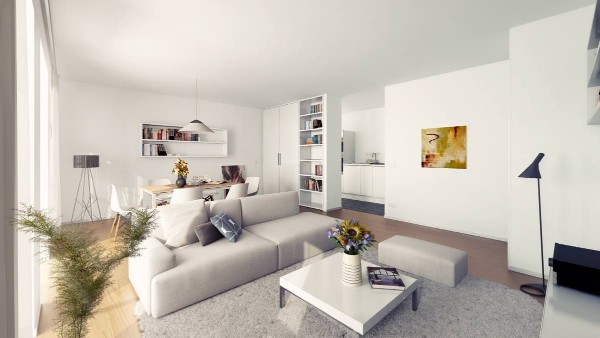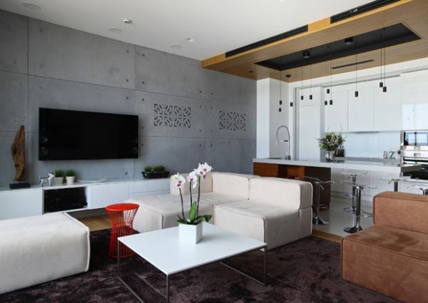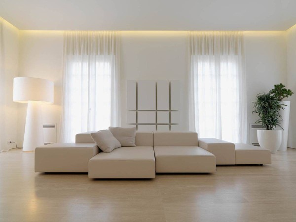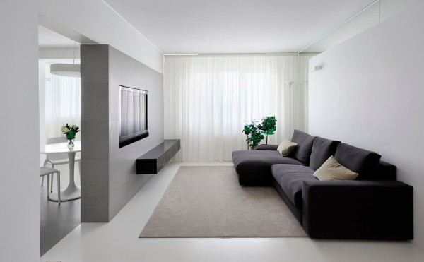 Мебель подбирается правильных геометрических форм, обивка монохромная, без излишеств. Для хранения вещей используются встроенные шкафы, которые сливаются со стенами. Это визуально делает пространство шире, наполняет помещение воздухом.
