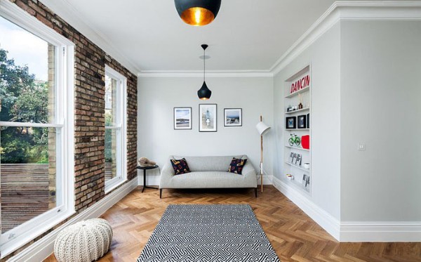 Используйте молочные оттенки бежевого для отделки стен. Напольное покрытие сделайте подчеркнуто темным. Разграничить контрастные цвета можно с помощью широкого напольного плинтуса белого цвета.