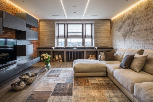 Но дорого — не обязательно много стоит. Вот примеры дизайна в стиле минимализм. В интерьере гостиной нет дорогостоящего напольного покрытия или мебели, но стиль выдержан.