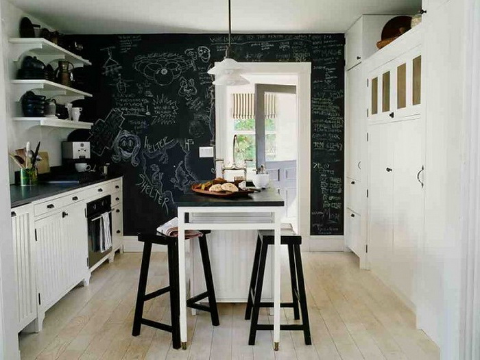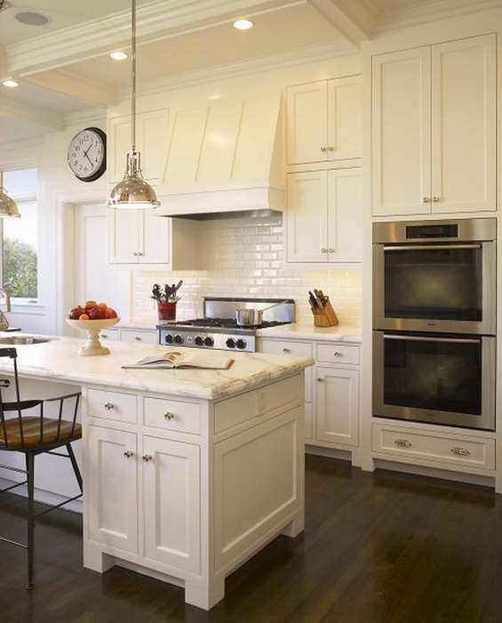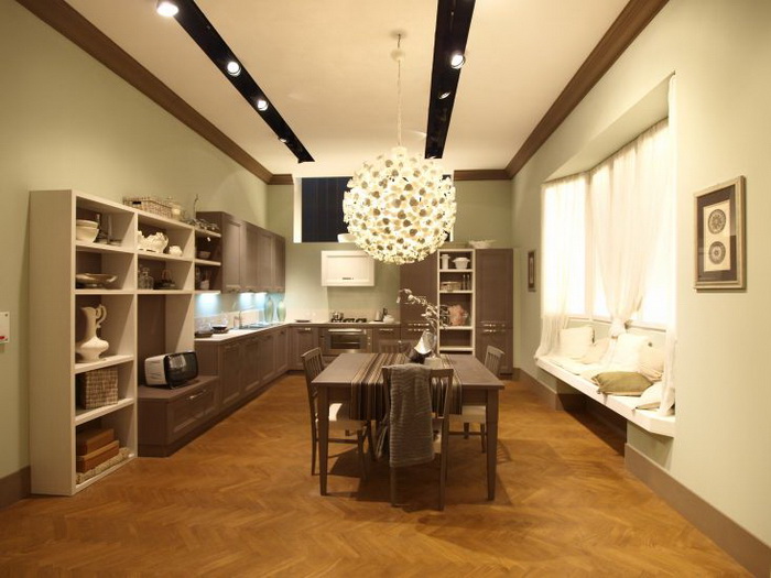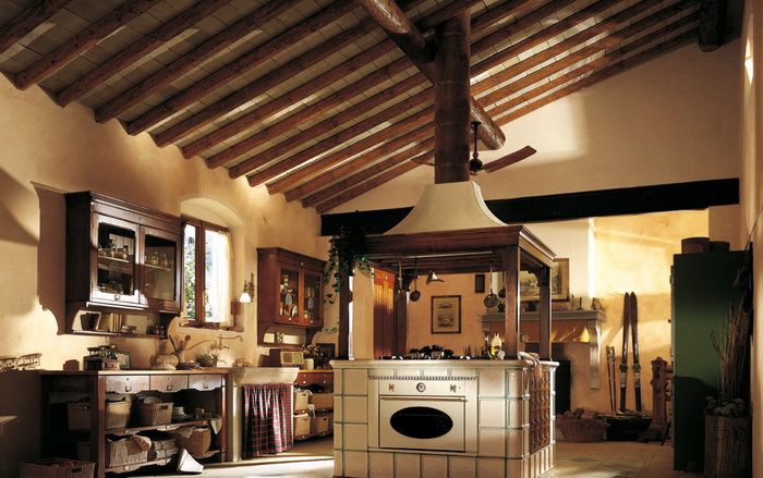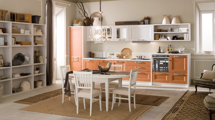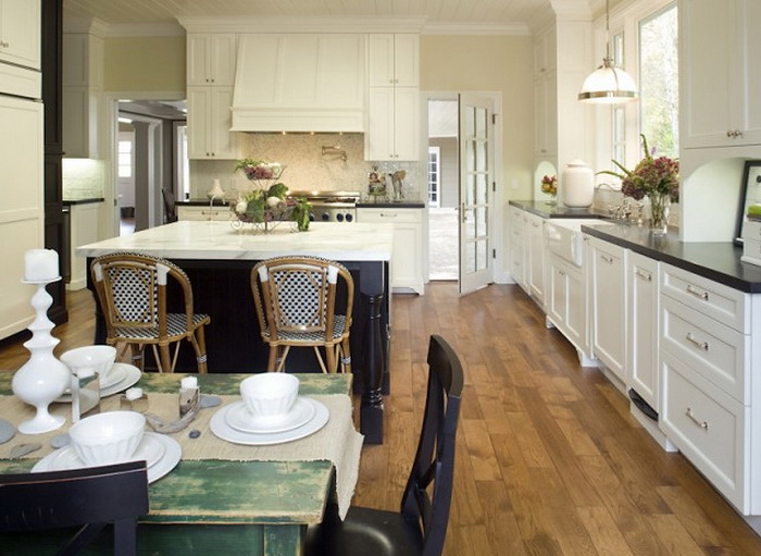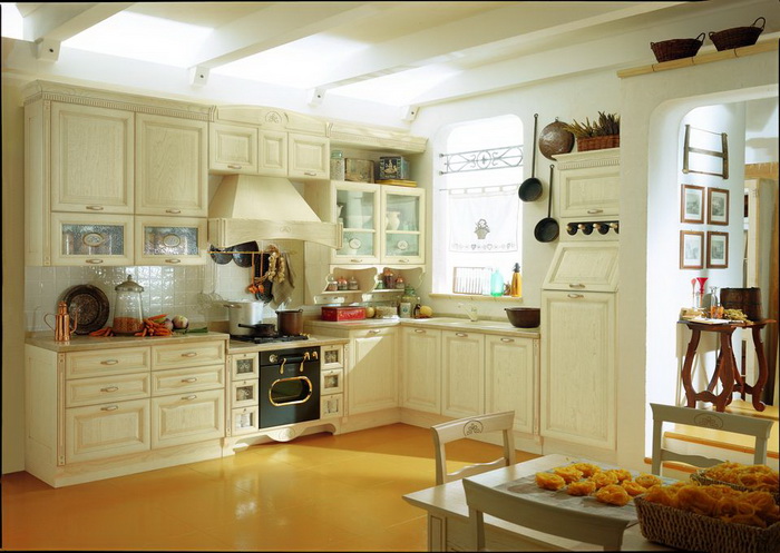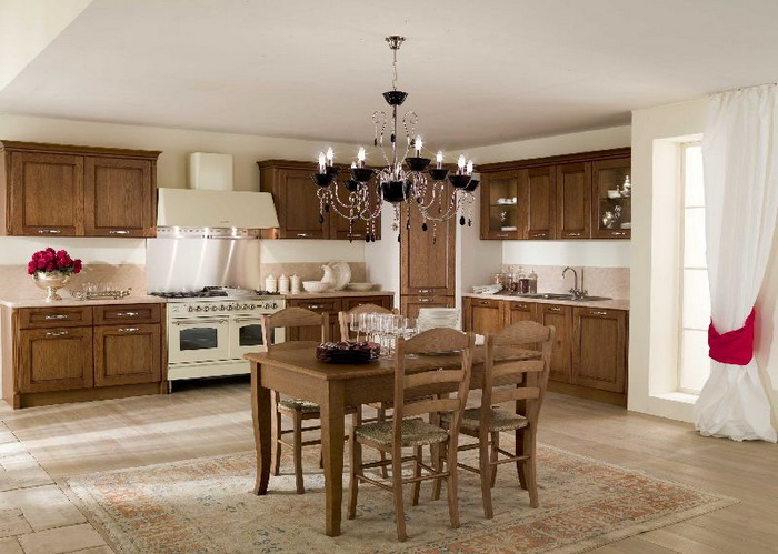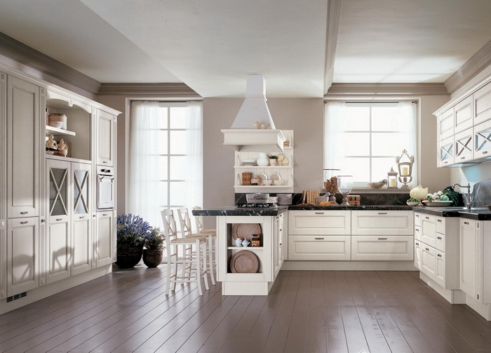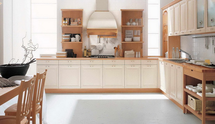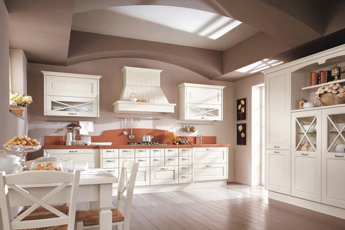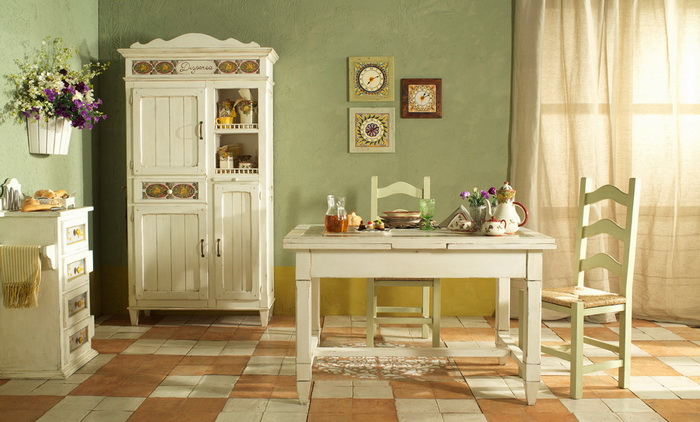 Мебель для кухни в стиле Прованс довольно проста, без изыска. Обязательно старая или состаренная, важным моментом является окрашивание поверхностей, мебель должна иметь тот вид, будто она верой и правдой служила многим поколениям. Это и стулья с резными, но облупившимися ножками, молочных оттенков комоды и шкафы для посуды. Для мебели в прованском стиле подойдут фасады светлых тонов из натурального дуба, каштана, ореха. Крашеные дверцы фасадов должны выглядеть слегка «потёртыми». Для придания достоверности интерьера, поверхности дерева искусственно состаривают, имитируют потёртости и сколы, следы червоточин. На полу покрашенные или необработанные доски или плитка. Интерьерам Прованса свойственна пастельная гамма с яркими цветовыми акцентами, грубоватая штукатурка с обнаженной кое-где кирпичной или каменной кладкой. Прованс в интерьере – это натуральная древесина и природный камень, тусклый блеск металла и теплая шершавость терракоты.