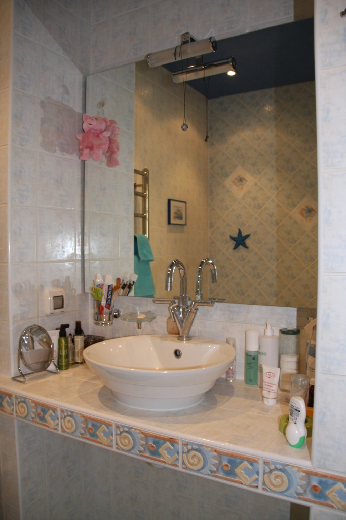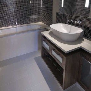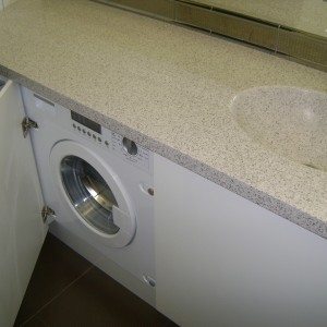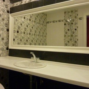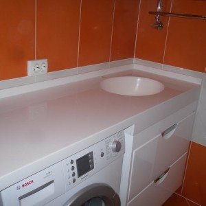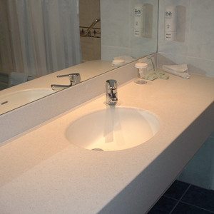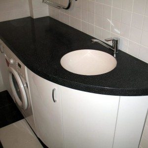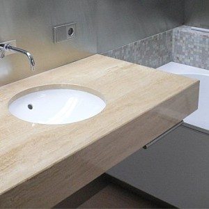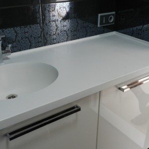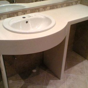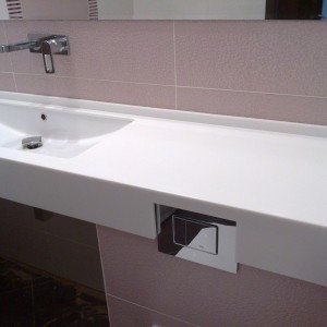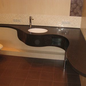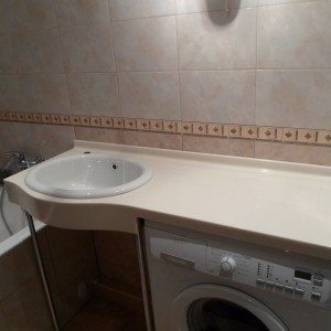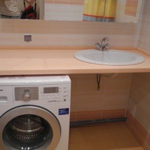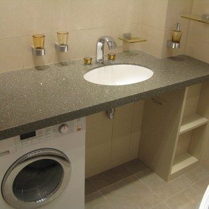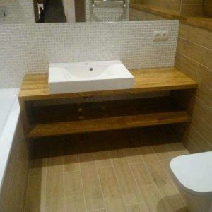- Ее устанавливают на монтируемый к прилегающим стенам прочный каркас. Собственно столешница изготавливается из плиты МДФ, обеспечивающей ей одновременно водостойкость и высокую прочность. Перед непосредственным монтажом должна в обязательном порядке быть рассчитана высота столешницы в ванной.