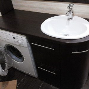 Уголок может быть как с дверцами, так и без: первый вариант позволит скрыть возможное нагромождение вещей и аксессуаров, второй обеспечит быстрый доступ ко всему необходимому. - Затем можно перейти к подбору и установке раковины. Для нашего случая наилучшим выбором станет раковина для ванной со столешницей, встраиваемая в последнюю, в противном случае потребуется дополнительная маскировка сливных коммуникаций.