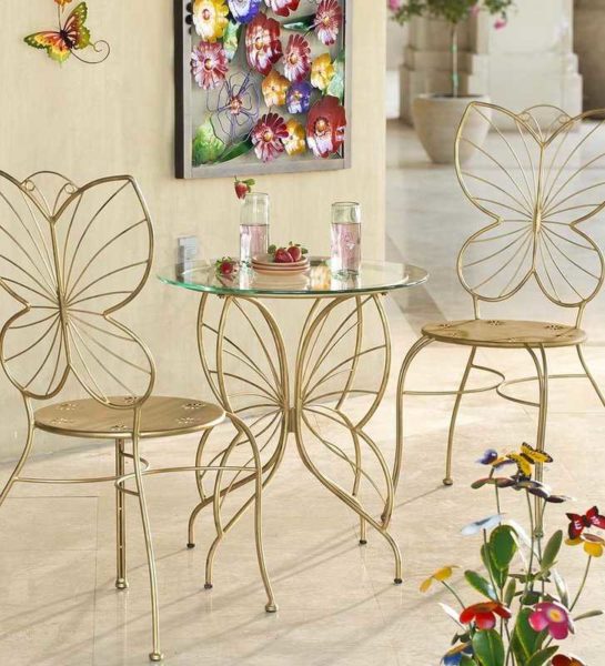 Стеклянные столы с кованными ножками и стулья в том же стиле