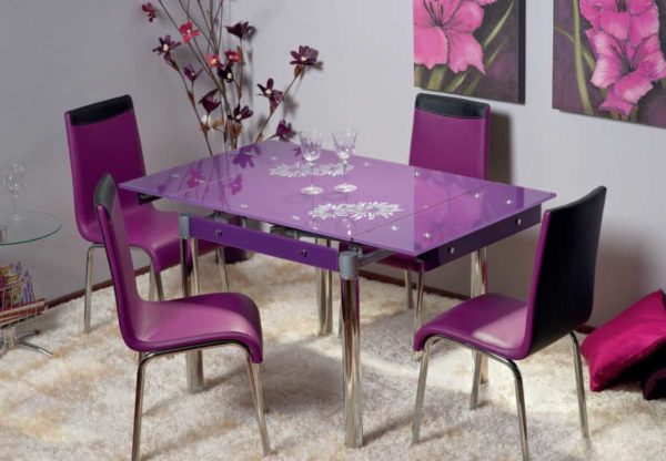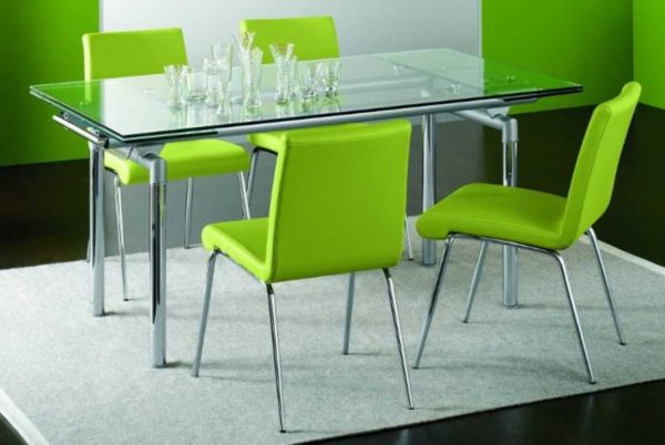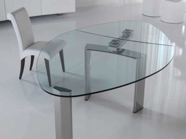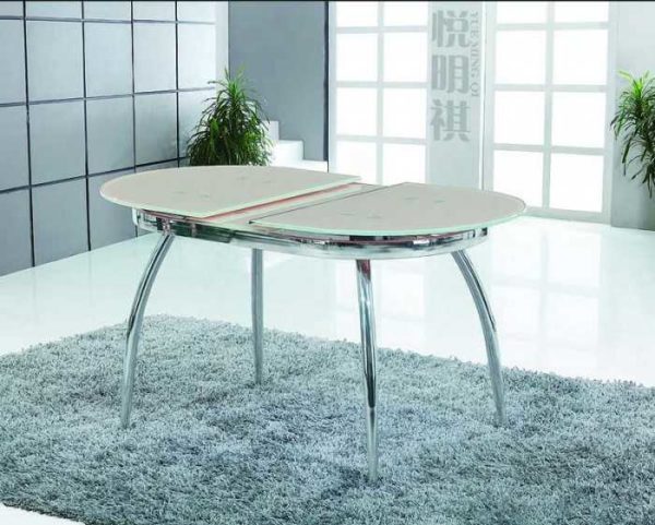 • Раскладные или раздвижные. Стол на кухню из стекла не настолько хрупкий, как кажется. К нему даже крепят фурнитуру, которая позволяет получить раскладывающиеся столешницы.
