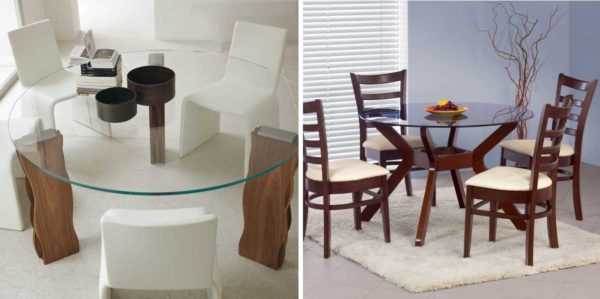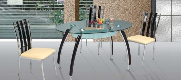 Подбирать надо сразу комплект: стеклянный кухонный стол и стулья к нему