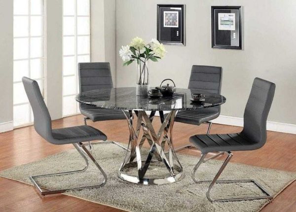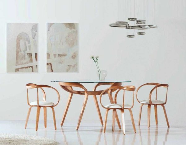Для стиля модерн характерны растительные орнаменты, так что могут быть они и в оформлении стола что в случае с ковкой несложно. Еще варианты — простой стол и необычные стулья. Один из приемов этого направления — контрасты. Так что можно сместить акцент именно на необычные стулья, а стеклянный стол на кухню будет обычной частью декора. В общем, подобрать подходящую модель для этого стиля оформления будет не так и сложно.
