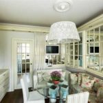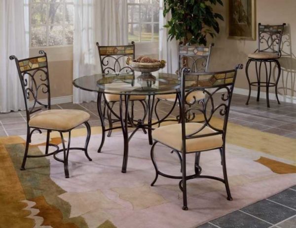 Естественно, стулья должны быть с такими же, так что придется искать набор — стеклянный стол с кованными ножками и стулья к нему. Если столешница будет прямоугольной, вдоль длинной стены можно будет поставить скамью.