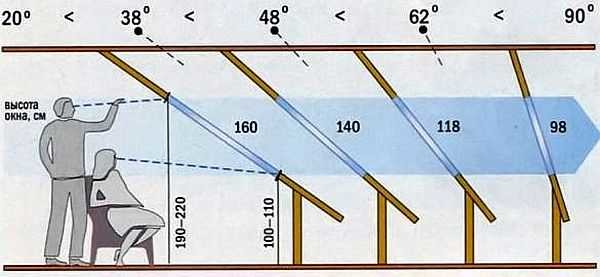 Чем круче наклон относительно пола, тем меньше должна быть высота окна