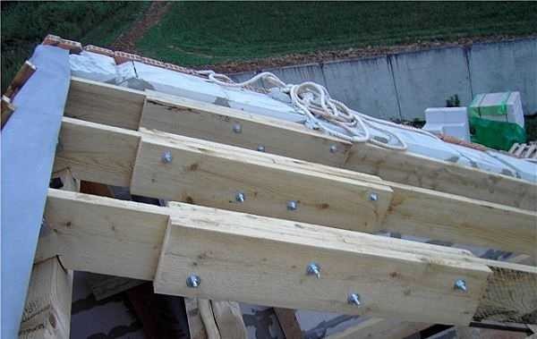 Второй вариант соединения боковых наслонных стропил и верхнего треугольника. Для более надежного крепления использованы болты.