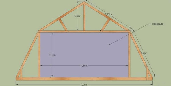 Выше на рисунке приведет чертеж каркаса с висячими стропилами. Он может быть реализован только в том случае, если основание верхнего треугольника будет не более 4,5 метров (в данном случае это ширина мансардного помещения). Если больше, придется делать наслонные стропила, которые должны опираться на несущую стену посредине (мансарда получится разделенной на две части рядом балок).