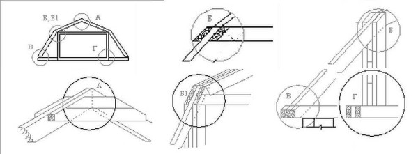 При монтаже стропильной системы могут возникнуть вопросы по сборке узлов — мест пересечения и соединения нескольких элементов конструкции. На фото вы видите чертежи ключевых соединений.