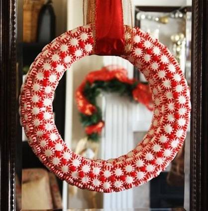 А вот такой венок был изготовлен из 2х больших пачек леденцов, которых соединили вокруг пластикового кольца. Вы также можете просто связать похожий узор на спицах. Примените толстые нити, возможно даже с ворсом, и ваш венок будет выглядеть достаточно сказочно и «по-новогоднему».