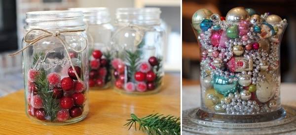 Доступный, простой и уютный декор для дома. Наполните глубокую стеклянную посуду елочными украшениями, искусственными ягодами, шишками и веточками ели, вставьте ароматизированные свечи, повяжите небольшой отрезок шпагата и вуаля! Прекрасные настольные украшения готовы. Поставьте их на подходящую скатерть и наслаждайтесь!