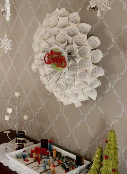 Интересная замена новогоднему венку — винтажный настенный декор из старого учебника по музыке. Идея превосходна в своей простоте! Как выполняется — объяснять не нужно, верно?