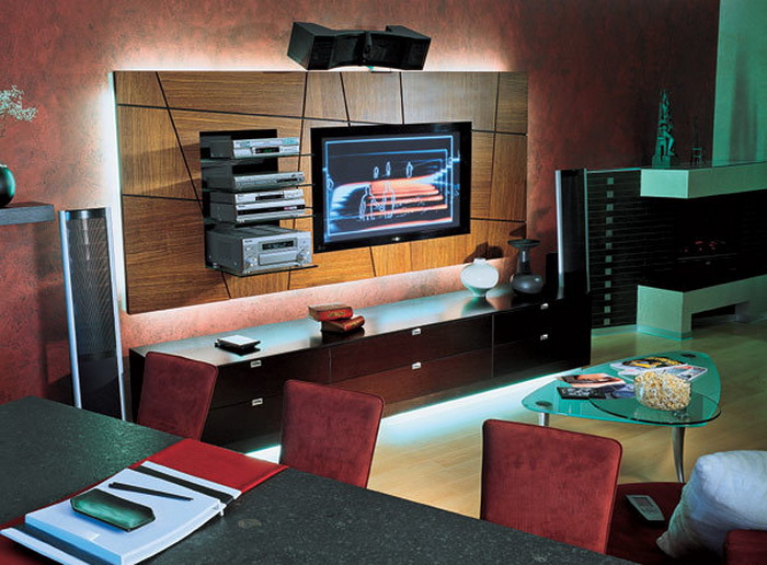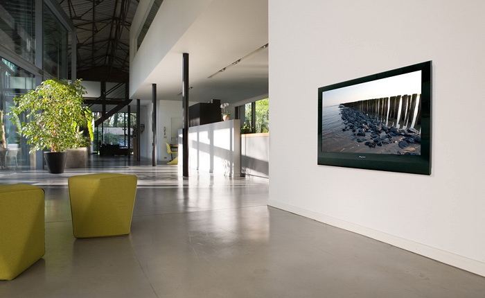 Благодаря значительным размерам и минималистичному дизайну телевизор становится доминантой в современных интерьерах. Один из вариантов превратить телевизионную панель в картину, разместив его среди домашних фотографий или вставив в багет. Как правило, для цельного восприятия всего комплекта оборудования домашнего кинотеатра часто выделяют стену, возле которой он размещён, с помощью другого цвета или материала. Для помещения большой площади будут актуальны натуральный камень или панели из дорогих сортов дерева. С точки зрения дизайна интерьера особенно важно, что стойки под плазменные телевизоры могут быть выполнены в самых разных материалах и цветах, как гармонирующих с общей палитрой интерьера, так и нарочито контрастирующих с ней.