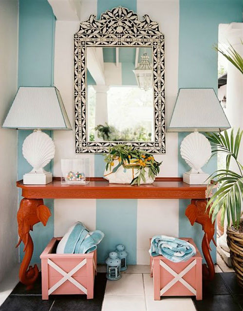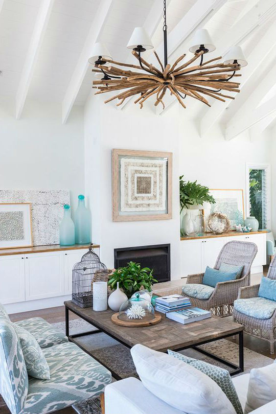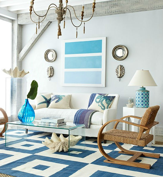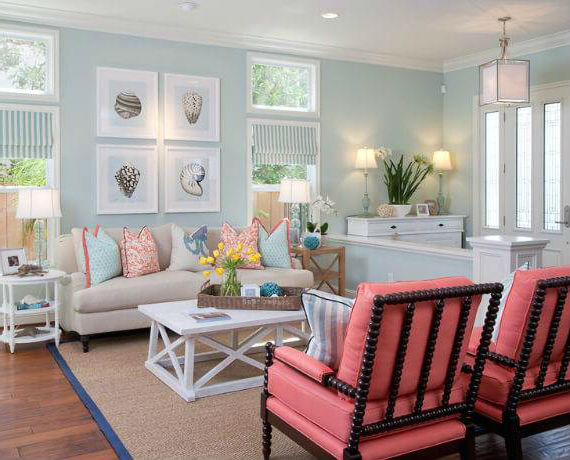 Здесь важно провести аналогию с отдыхом на пляже, какую цветовую гамму мы обычно видим вокруг: желтый песок, голубое небо, синее море, зеленые водоросли. Так вот все эти тона являются как бы законодателями данного стиля, но нельзя забывать, что у каждого озвученного выше цвета есть свои подтона, вот все их как раз и можно применять в оформлении дома. Соответственно подойдет: синий, лазурный, бирюзовый, голубой, лавандовый, светло-серый, желтый, бежевый, горчичный, кремовый, белый, янтарный, зеленый, лососевый, коралловый, бледно-коричневый.