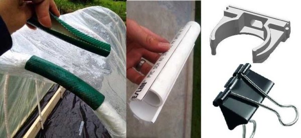 Еще народ использует канцелярские биндеры подходящего размера. Это устройство неплохо удерживает, но из-за того, что это металл, есть возможность при сильном ветре пленку порвет. Чтобы этого не случилось, можно подложить кусок ткани.
