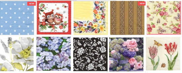 Для декупажа используются салфетки и бумага с нанесенным рисунком. Они наклеиваются на поверхность, покрываются лаком. Есть следующие виды материалов для того вида декора: